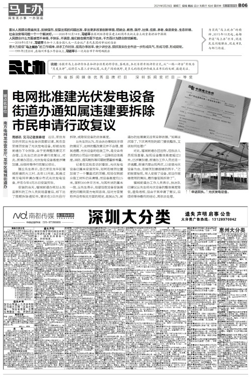 被点名单位南方电网龙华营业厅、龙华区福城街道办南都讯 见习记者吴春熠 近日,家住龙华的市民丘先生告诉南都记者,其在自家楼顶安装了光伏发电设备,却被当地街道办下令拆除。由于觉得整改意见不合理,丘先生已依