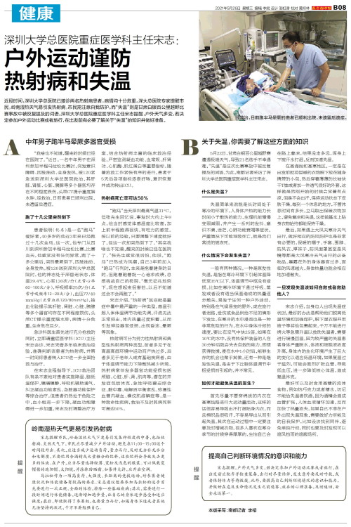近段时间,深圳大学总医院已接诊两名热射病患者,病情均十分危重。深大总医院专家提醒市民,岭南湿热天气易引发热射病,市民需注意自我防护。而“失温”则是甘肃白银百公里越野比赛事故中被反复提及的词语。深圳大学
