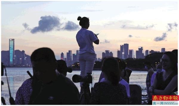 大图:超级月全食5月26日上演,深圳市民早早找好位置等着看“带食月出”。 南都记者 胡可 摄