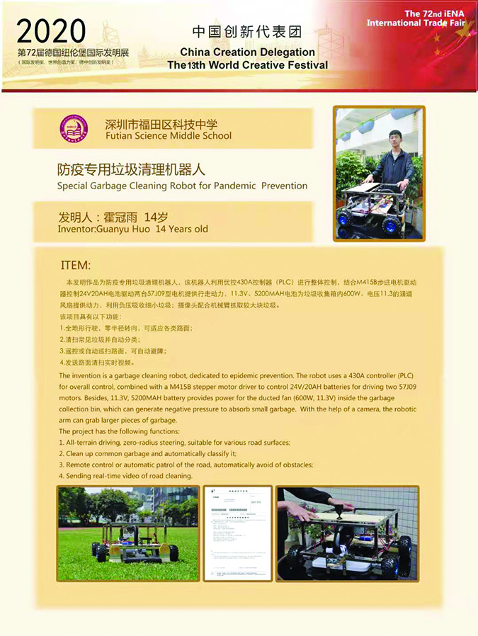 2020年,科中学子在各项科技、科普类竞赛活动中均有突出表现,先后获得“第72届德国纽伦堡国际发明展及德国创新研究院奖”(金奖4项和银奖2项);“2020中国青少年创造力大赛暨给钟南山院士的一个创意活动”中获得一等奖5项、二等奖2项;“第24届全国发明展”金奖1项、银奖1项、铜奖3项及宝武青少年发明奖;“2020世界青少年机器人大赛总决赛”晋级8强、二等奖1项、三等奖1项;“第21届广东省青少年机器人大赛”一等奖2项;“第35届广东省青少年科技创新大赛”二等奖2项和三等奖1项;“第十八届广东省少年儿童发明奖”一等奖3项;“第36届深圳市青少年科技创新大赛”一等奖5项;“第9届深圳市青少年知识产权大奖赛”特等奖;“2020深港澳大湾区机器人大赛”季军;“第20届福田区青少年科技节”一等奖15项;“深圳科普剧大赛”一等奖;“2020年科技硬件迷你展—青少年创客展”优秀小创客称号10人,多位教师荣获“广东省优秀科技辅导员”荣誉称号。2021年3月,在第36届广东省青少年科技创新大赛上获得五枚金牌,揽获六项大奖,夺得全省初中参赛学校最好成绩。科中师生陆续登上全国高水平科技竞赛的舞台和殿堂,打造了一支中国青少年科学界、发明创造界的瞩目“天团”。