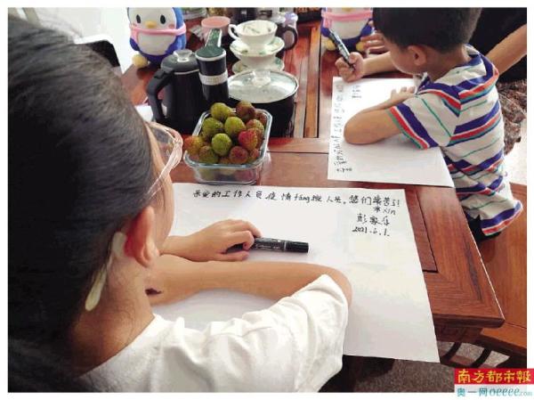 在妈妈的倡议下,姐弟俩也拿出纸慢慢写下对防疫工作人员的祝福。彭家乐写道“亲爱的工作人员、疫情防控人员,您们辛苦了!”“防”字不会写,她就用拼音代替。“辛”字写错了,在妈妈的提醒下,彭家乐进行修改,却再次写错。无奈之下,她还是用拼音进行了代替。看得出来,彭家乐有些不好意思。弟弟彭家骏则因为年纪小,大多字都写的拼音。其间妈妈想代替他写,但被他果断拒绝。