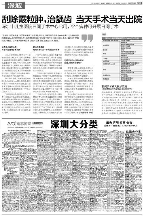 “没想到,当天做手术,当天就能出院”,6月1日,深圳市儿童医院日间手术中心启用,22个病种的手术将能在24小时内完成入院、手术并办理出院。在为孩子预约了日间手术后,患儿小毅(化名)的妈妈高兴地说,