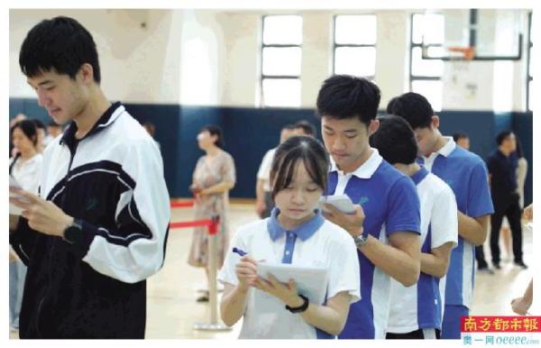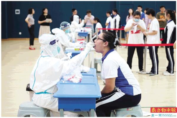 6月3日,南山外国语学校(集团)高级中学内,高三学生拿着书本等候进行核酸检测。南都记者 霍健斌 摄