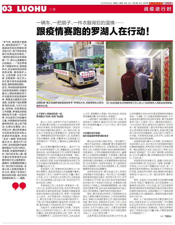 战疫进行时 “天气热,拿把扇子扇扇风,很快就到您了!”“这是接送您前往核酸检测点的大巴,等下您检测完我们会再送您回家的。”“接种后请您在此休息观察一下,有什么需要都可以和我说……”走在罗湖多个核