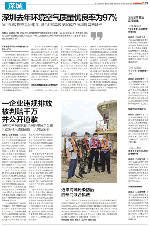 南都讯 记者张小玲 2020年,全市环境空气质量指数达到国家一级(优)和二级(良)的天数为355天,占全年监测有效天数366天的97.0%。近日公布的2020年深圳生态环境状况公报显示,生态环境状况级