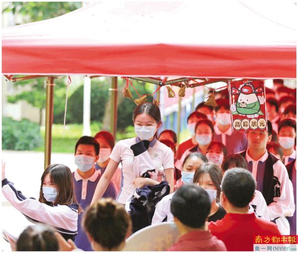 龙岗区平冈中学考点挂上了粽子和“高粽状元”的牌子,期待考生们可以“一跃高粽”。 校方供图