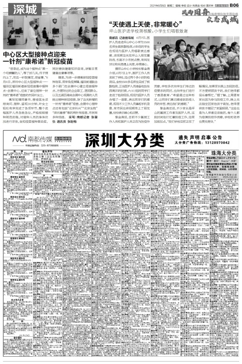 南都讯 记者曾海城 6月7日,医护人员走进坪山中心小学为1500名师生做核酸检测,6年级的学生在现场为医护人员唱歌表达感谢,该视频当天在坪山人朋友圈热传,引起不少市民点赞,有网友评论称天使遇上天使,非