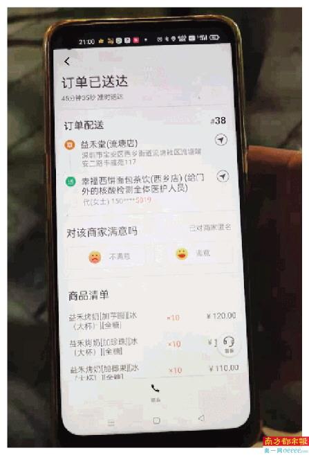 南都讯 记者蒋津津 通讯员都广婷 刘平 6月7日晚上,一位快递小哥给西乡街道西乡社区北帝古庙广场核酸采样点工作人员送来了30杯冰奶茶,但现场的工作人员却纷纷表示“这不是我们点的”。是不是快递小哥送错了?