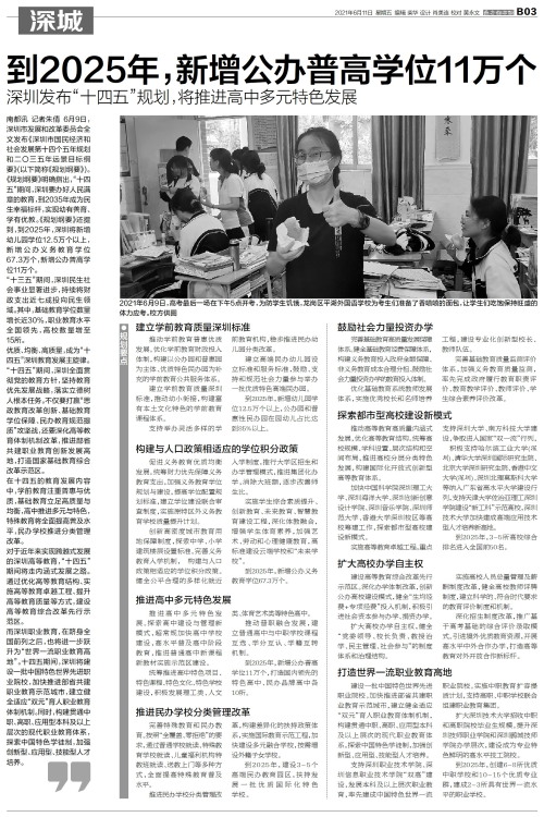 南都讯 记者朱倩 6月9日,深圳市发展和改革委员会全文发布《深圳市国民经济和社会发展第十四个五年规划和二〇三五年远景目标纲要》(以下简称《规划纲要》)。《规划纲要》明确指出,“十四五”期间,深圳要办好