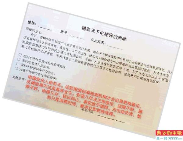 据业主称,在5月17日上午部分业主准备向物管方面递交问卷的同时,业主们也自发开展了要求茂业更换电梯的签名活动。但5月14日17时30分许,传来茂业方面同意更换电梯的消息,物管方面的问卷调查随即不了了之。“那么,在这种情况下,不论是深圳市特种设备安全检验研究院还是深圳市电梯行业协会,皆不是业主所做选择”。
