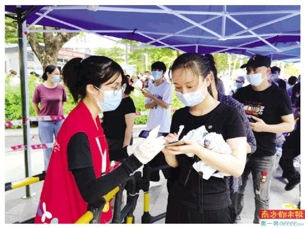 说罢,时间已临近16时,又快到新一批居民做核酸检测的时间了。她赶忙穿上红马甲,快步来到海燕广场。这里是人民南商圈的核心地带之一,金光华广场等众多商超林立,核酸检测任务并不轻松。马秀明一来到现场便立刻忙碌起来,拿到分派的号码牌后,马秀明站在一条有序的“长龙”队伍前,扯高音量喊,“请大家把‘深i您健康码’打开,手机屏幕调到最亮,方便加快检测速度。”随后认真检查每一个居民的二维码,时不时还要解答居民的疑惑。