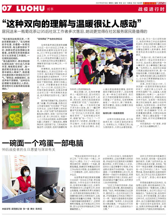 战疫进行时“每次看到这瓶菊花茶,一天的劳累都消除了。”在马秀明的手机里,珍藏着一张菊花茶特写照,每当累到想趴下时,她都会把这张图翻出来看看。这瓶菊花茶是她最近在忙社区防疫工作期间,一位居民送给她的