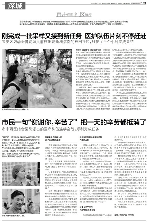6月18日上午10时许,深圳市中西医结合医院接到组建一支50人采样队前往福永福围社区紧急采样的任务。半小时内,50人队伍集齐出发。奋战至19日凌晨5点,顺利完成任务。在此过程中,有人衣服能直接拧出