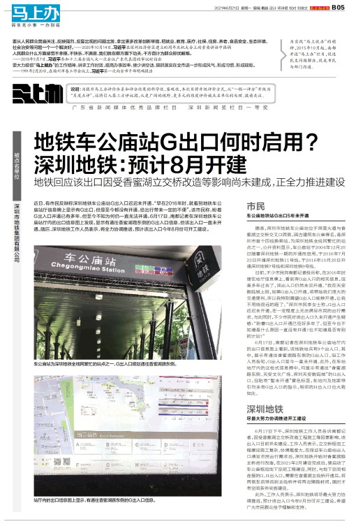 地铁车公庙站G出口何时启用?深圳地铁:预计8月开建