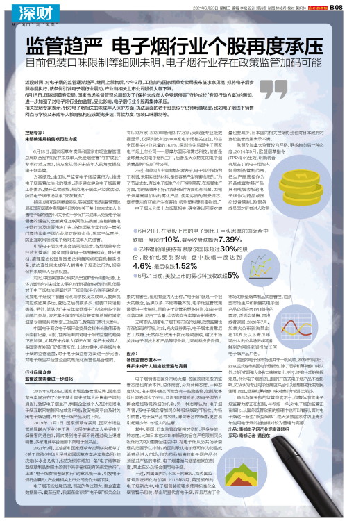 ●6月21日,在港股上市的电子烟代工巨头思摩尔国际盘中跌幅一度超过10%,截至收盘跌幅为7.39% ●亿纬锂能间接持有思摩尔国际超过30%的股份,股价也受到影响,盘中跌幅一度