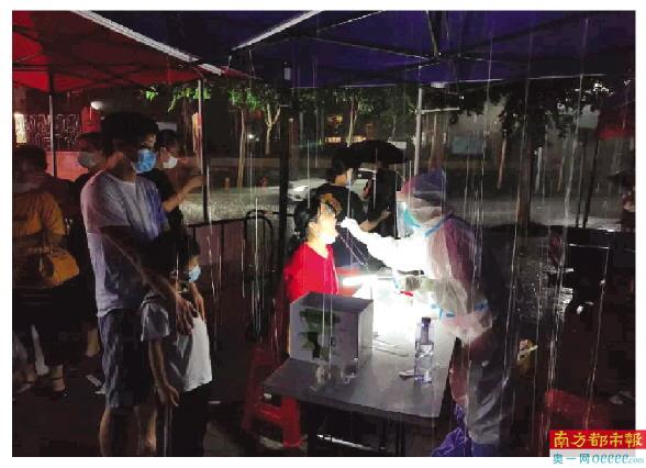 风雨中,医护人员、志愿者用台灯照亮检测点,继续为居民进行核酸采样。
