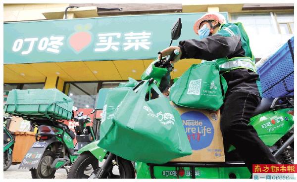 一名外送员从叮咚买菜的前置仓出发送货。 新华社图片