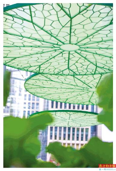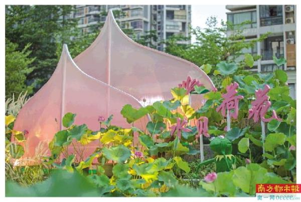 其中,红荷传情(水贝壹号广场)充分利用场地台地地形,依次布置巨大的粉色造型荷花瓣,与白色的花瓣状木台阶组成戏剧化的舞台布景效果,选取中国红·嘉兴、中国红·韶山为主,配以姜荷花、观赏草等多种植物,呈现都市中的荷塘错落的别致景观。荷叶青青(水贝壹号广场)巧妙地将三片巨大的造型莲叶吊起形成遮阴绿廊,阳光从镂空的叶脉与轻纱中洒下,柔和的光线下流线型花台被荷叶围绕,为炎炎夏日带来一份专属的凉爽。荷你藕遇(水贝壹号广场)大小高低不同粉白色莲藕,自然随机摆放,与荷花绣球花境组合,透过莲藕的孔洞,可以看见远近的花境和建筑,烘托出生动趣味的整体氛围。