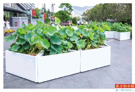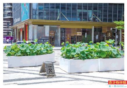 钻石莲心(水贝金座广场)花钵紧扣珠宝特点组合成钻石形状,白粉荷花渐次盛开,行走其中,感受粉黛环绕的浪漫雅致。荷荷美美(水贝银座广场)以白色钢板制成高低不同的花瓣形状,反向围合,搭配各色荷花,形成不同角度的空间变化,营造丰富的景观效果,多角度观赏均达到美学标准。映日荷花(水贝国际)三角形白色花钵满种荷花,以巧妙的形式组合,沐浴朝霞落日,自然形成映日荷花别样红的景观效果。