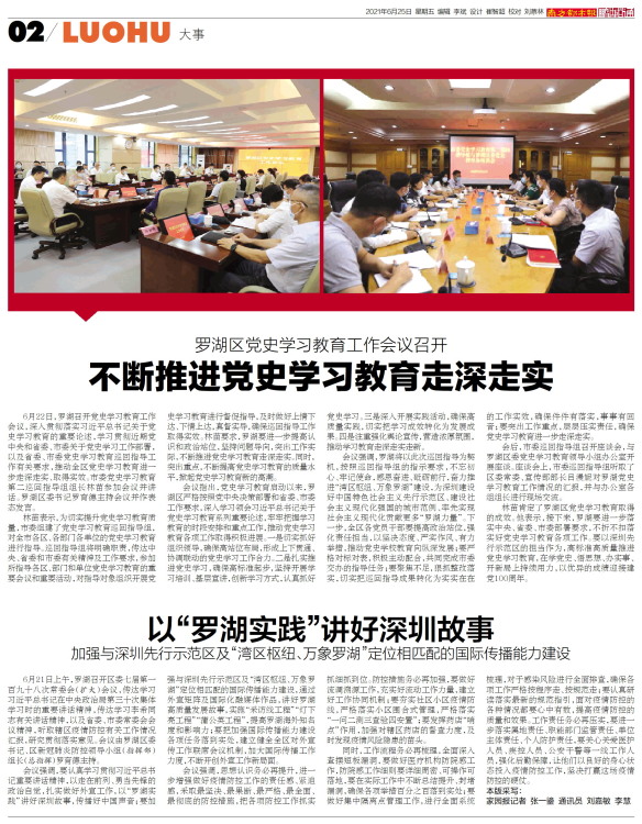 6月22日,罗湖召开党史学习教育工作会议,深入贯彻落实习近平总书记关于党史学习教育的重要论述,学习贯彻近期党中央和省委、市委关于党史学习工作部署,以及省委、市委党史学习教育巡回指导工作有关要求,推