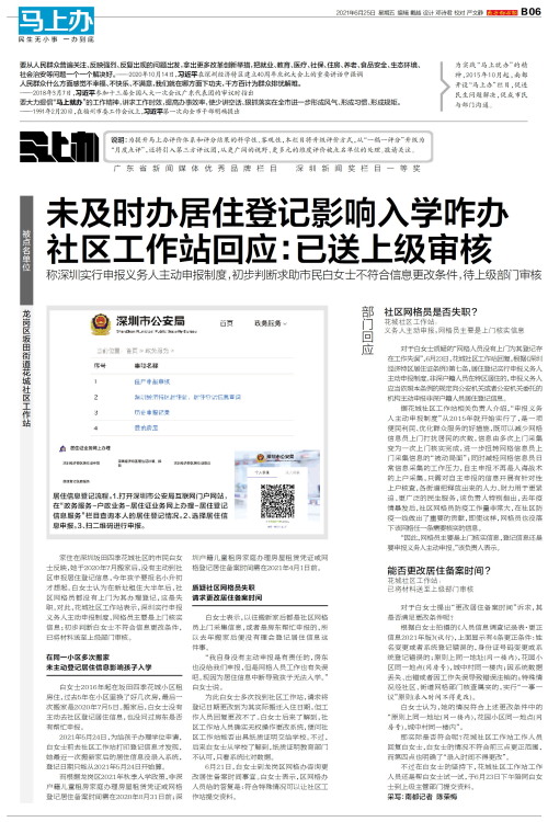 被点名单位 龙岗区坂田街道花城社区工作站 家住在深圳坂田四季花城社区的市民白女士反映,她于2020年7月搬家后,没有主动到社区申报居住登记信息,今年孩子要报名小升初才想起。白女士认为在新址租住