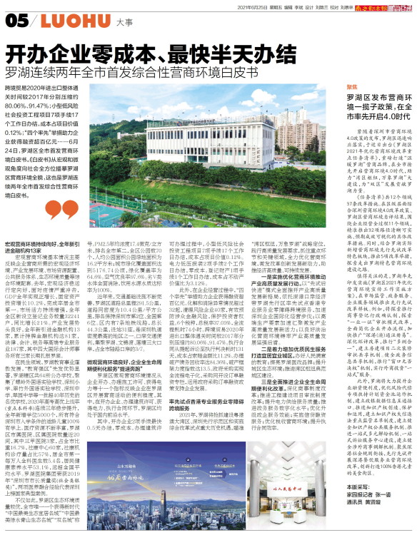 跨境贸易2020年进出口整体通关时间较2017年分别压缩约80.06%、91.47%;小型低风险社会投资工程项目7项手续17个工作日办结,成本占项目价值0.12%;“四个率先”举措助力企业获得融资