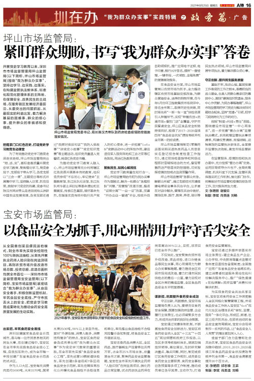 开展党史学习教育以来,深圳市市场监督管理局坪山监管局(以下简称,坪山市场监管局)围绕“我为群众办实事”,坚持边学习、边实践、边落实。在构建监管执法新体系、标准化规范化管理体系的主阵地,在保障安全、