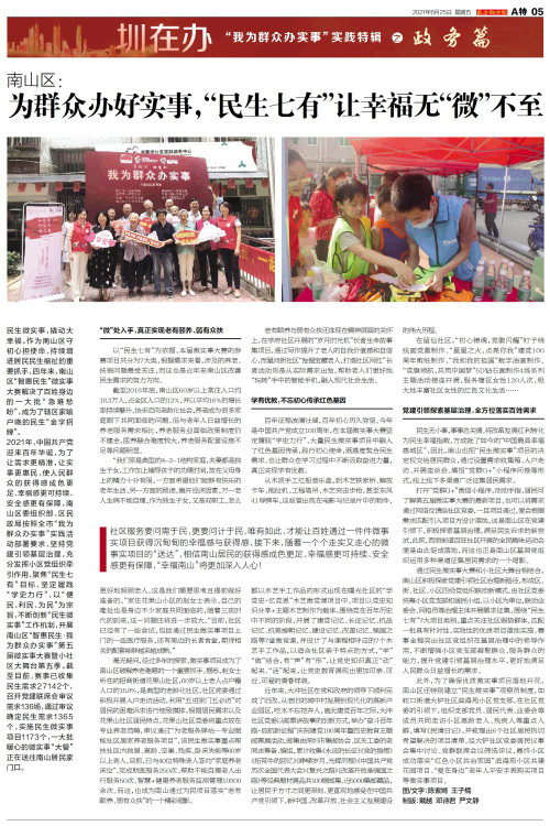 民生微实事,撬动大幸福。作为南山区守初心担使命、持续增进居民民生福祉的重要抓手,四年来,南山区“智惠民生”微实事大赛解决了百姓身边的一大批“急难愁盼”,成为了辖区家喻户晓的民生“金字