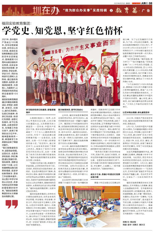 2021年,是中国共产党成立100周年,百年征程波澜壮阔,百年初心历久弥坚。福田区实验教育集团立足党的百年历史新起点,围绕建党100周年光辉历程和丰功伟绩,动员全体党员学史明理、学史增信、学史崇德