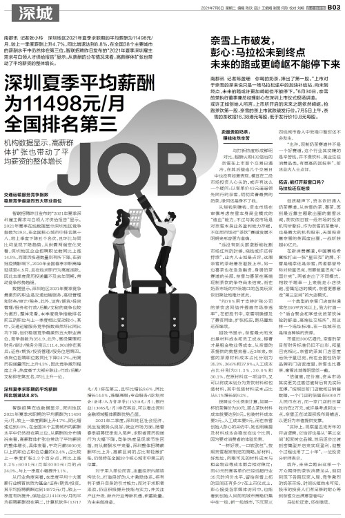 南都讯 记者张小玲 深圳地区2021年夏季求职期的平均薪酬为11498元/月,较上一季度薪酬上升4.7%,同比增速达到8.8%,在全国38个主要城市的薪酬水平中仍然排在第三位。智联招聘昨日发布