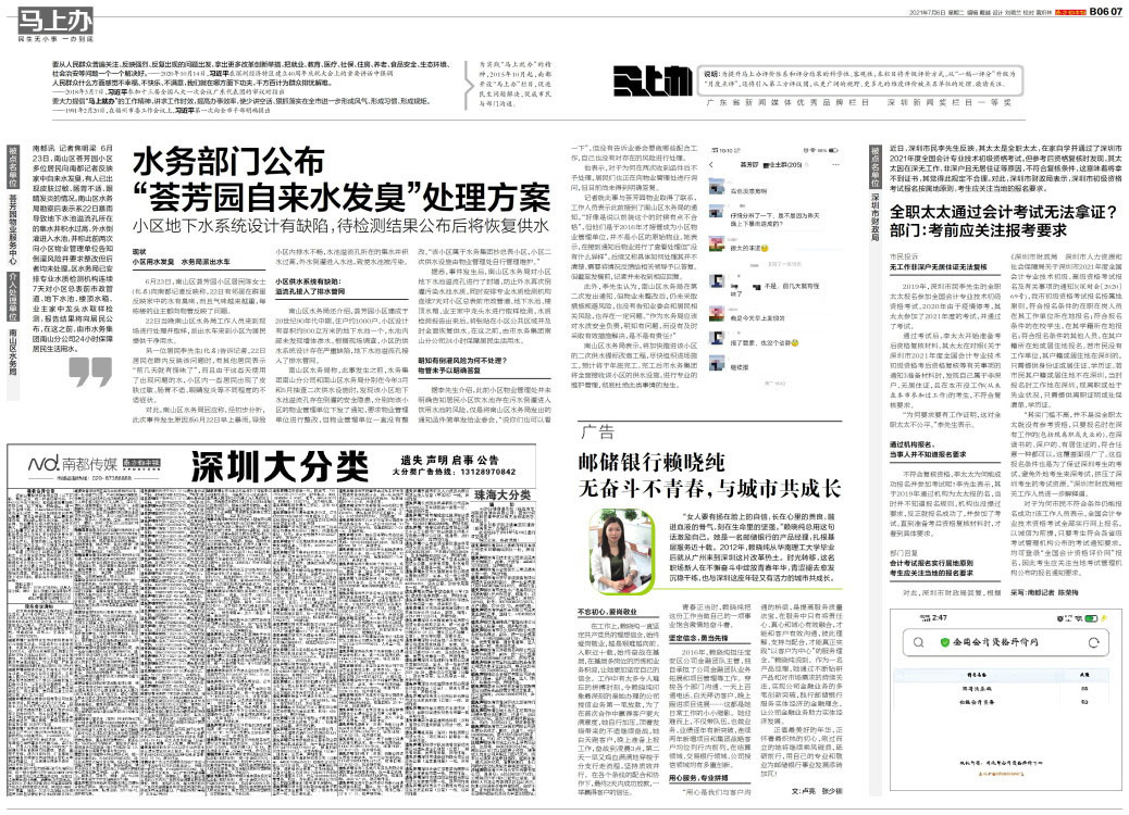 被点名单位 荟芳园物业服务中心 介入处理单位 南山区水务局 南都讯 记者焦明梁 6月23日,南山区荟芳园小区多位居民向南都记者反映家中自来水发臭,有人已出现皮肤过敏、肠胃不适、眼睛发炎的情