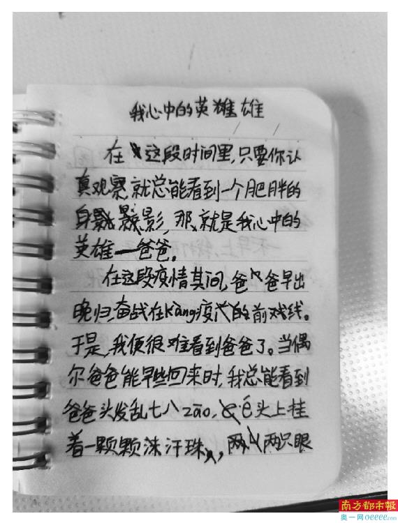 由于夫妻俩都在抗疫一线工作,甘峰只能将10岁的女儿交给同小区的同事帮忙照顾。昨天解封后,甘峰的女儿写了一篇作文《我心中的英雄》。文中写道,“在这段疫情期间,爸爸早出晚归,奋战在抗疫前线,当偶尔爸爸能早些回家时,我总能看到爸爸头发乱七八糟,额头上挂着一颗颗汗珠,两只眼睛周围都是熊猫似的黑眼圈,我十分心疼爸爸。”