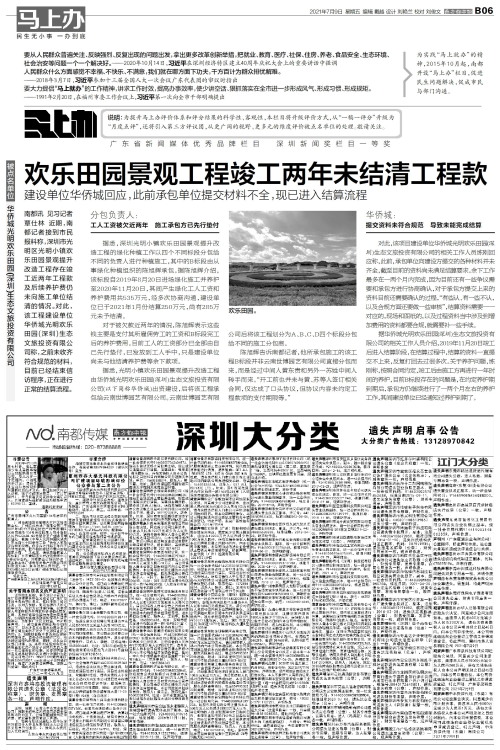 被点名单位 华侨城光明欢乐田园(深圳)生态文旅投资有限公司 南都讯 见习记者覃仕林 近期,南都记者接到市民报料称,深圳市光明区光明小镇欢乐田园景观提升改造工程存在竣工近两年工程款及后续养护费仍