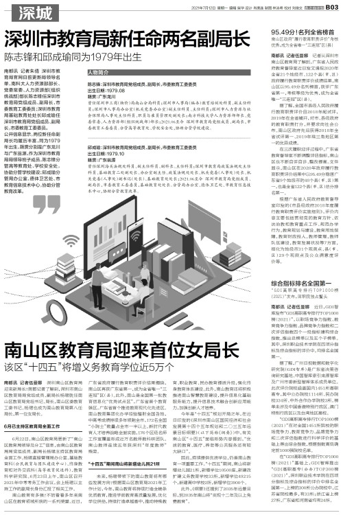 公开信息显示,两位新任命副局长均履历丰富,同为1979年出生,籍贯分别是广东龙川与广东翁源。作为深圳市教育局局领导班子成员,陈志锋分管高等教育处、学校安全处,协助分管学校建设;邱成瑜分管局办公室、德体卫艺处、市教育信息技术中心,协助分管教育改革。