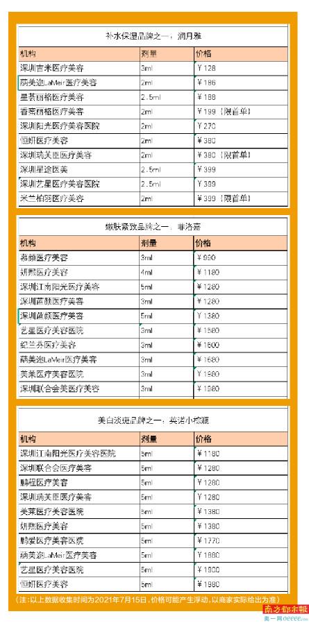 南都新医美观察课题组经过调查发现,目前深圳医美市场上的水光针品牌简直多到让人眼花缭乱,部分大型连锁医美机构光是水光针品牌就有超10种,有国产的润百颜、润月雅、伊肤泉、欣菲聆、昕芙康等,也有进口韩国、法国、英国等国家的品牌,如菲洛嘉、丝丽、瑞蓝、英诺小棕瓶、旖提丝等。价格则因品牌种类、剂量、注射部位等因素而不同,低则一百多,高可至六七千元。