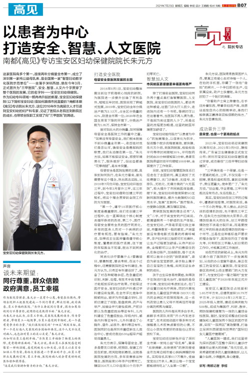 院长专访 这家医院有多个第一。连续两年分娩量全市第一,成立了深圳第一家纯公益母乳库,是全国第一家“智慧妇幼数字化医院示范单位”……坐落于深圳西部,就在今年3月,正式晋升为“三甲医院”,安全、智慧
