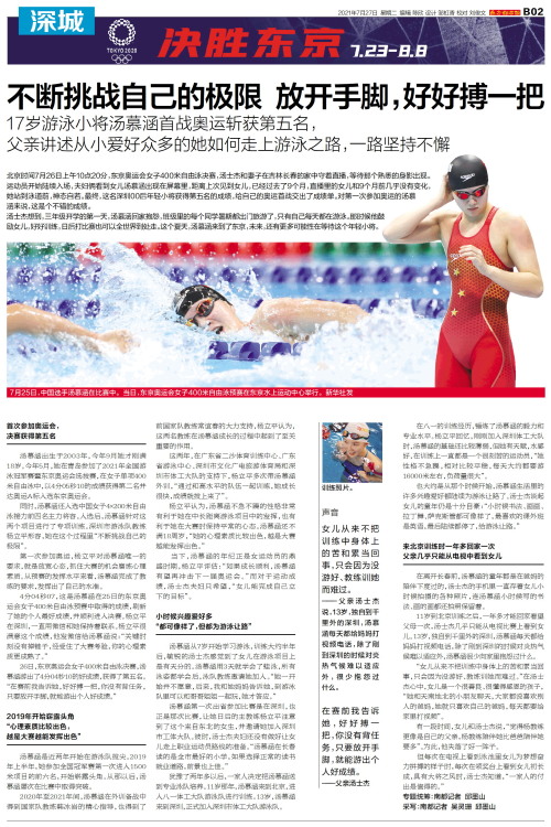 北京时间7月26日上午10点20分,东京奥运会女子400米自由泳决赛,汤士杰和妻子在吉林长春的家中守着直播,等待那个熟悉的身影出现。运动员开始陆续入场,夫妇俩看到女儿汤慕涵出现在屏幕里,距离上次见