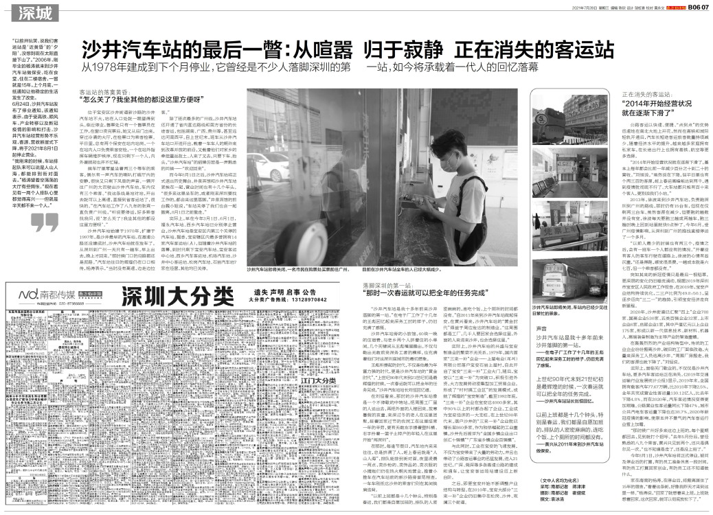 “以前开玩笑,说我们客运站是‘近黄昏’的‘夕阳’,没想到现在太阳直接下山了。”2006年,刚毕业的杨涛就来到沙井汽车站做保安,吃在食堂,住在二楼宿舍,一留就是15年。上个月底,一纸通知让他稳定的生