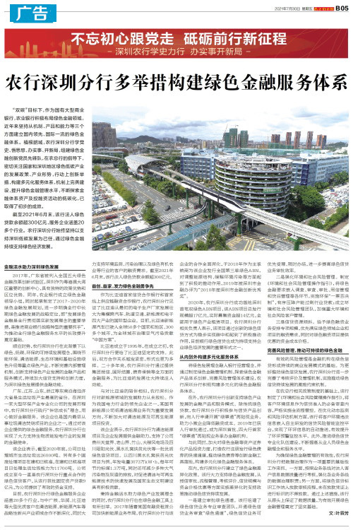 “双碳”目标下,作为国有大型商业银行,农业银行积极布局绿色金融领域,近年来坚持从机制、产品和能力等三个方面建立国内领先、国际一流的绿色金融体系。植根鹏城,农行深圳分行学党史、悟思想、办实事、开新局