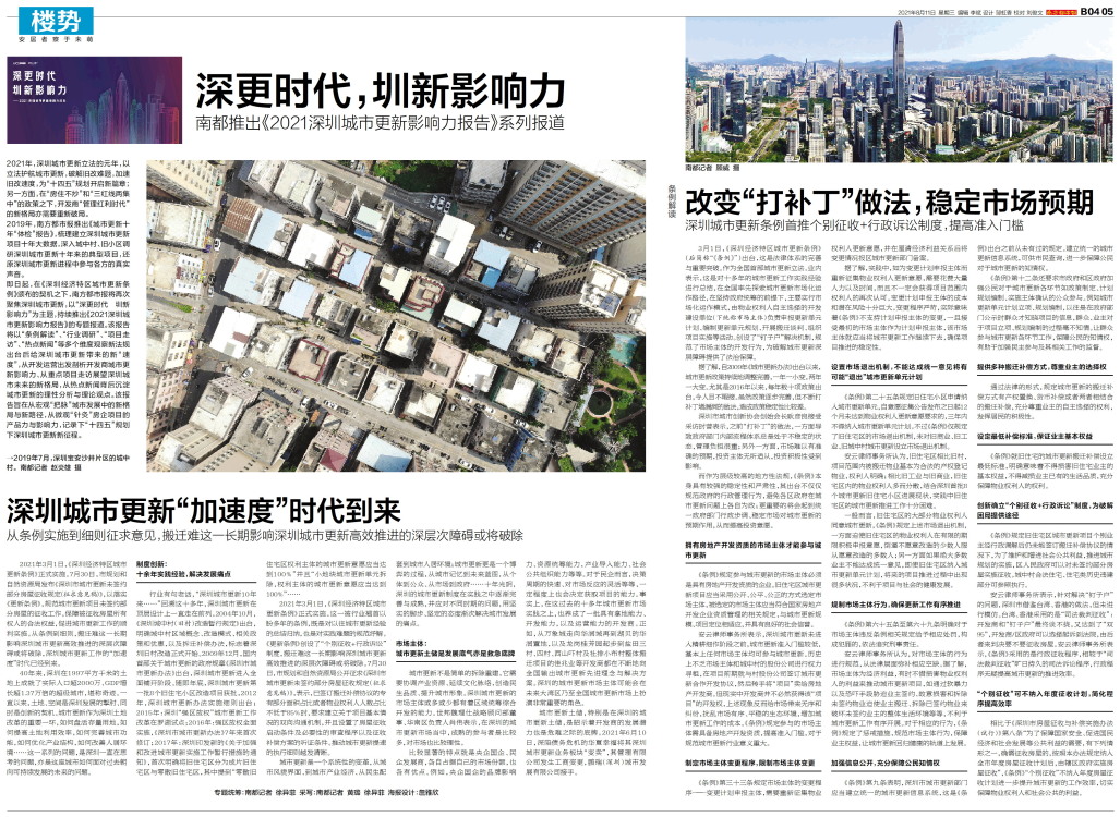 即日起,在《深圳经济特区城市更新条例》颁布的契机之下,南方都市报将再次聚焦深圳城市更新,以“深更时代 圳新影响力”为主题,持续推出《2021深圳城市更新影响力报告》的专题报道。该报告将以“条例解读”、“行业调研”、“项目走访”、“热点新闻”等多个维度观察新法规出台后给深圳城市更新带来的新“速度”,从开发运营出发剖析开发商城市更新影响力、从重点项目走访展望深圳城市未来的新格局,从热点新闻背后沉淀城市更新的理性分析与理论观点。该报告旨在从宏观“把脉”城市发展中的新格局与新路径,从微观“针灸”房企项目的产品力与影响力,记录下“十四五”规划下深圳城市更新新征程。