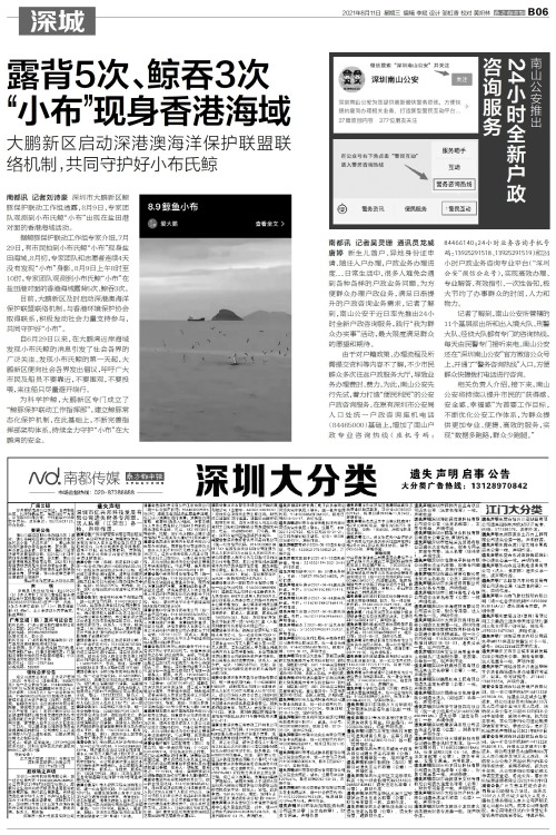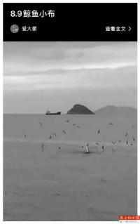 南都讯 记者刘诗豪 深圳市大鹏新区鲸豚保护联动工作组透露,8月9日,专家团队观测到小布氏鲸“小布”出现在盐田港对面的香港海域活动。 据鲸豚保护联动工作组专家介绍,7月29日,有市民拍到小布氏鲸“