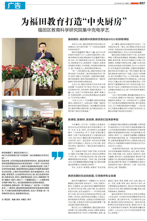 教师放暑假了,教研员在做什么? 他们为深圳教育打造“中央厨房”,他们放暑假比开学还忙碌…… 知名学者、北京市海淀区教师进修学校校长、海淀区教师进修学校