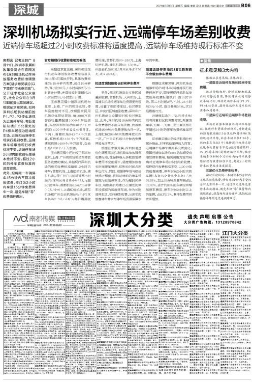 南都讯 记者王睦广 8月11日,深圳市发展和改革委员会在官网发布《深圳机场机动车停放服务收费标准调整方案(征求意见稿)》(以下简称“征求意见稿”),公开征求社会公众意见,社会公众可在9月13日前提出意见建议。