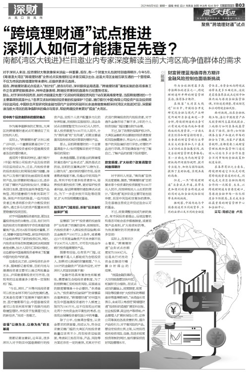 对于深圳人来说,投资理财大概就像柴米油盐一样重要。现在,有一个财富大礼包就特别值得期许。今年5月,《粤港澳大湾区“跨境理财通”业务试点实施细则(征求意见稿)》出台,这是大湾区金融互联互通的一个里程