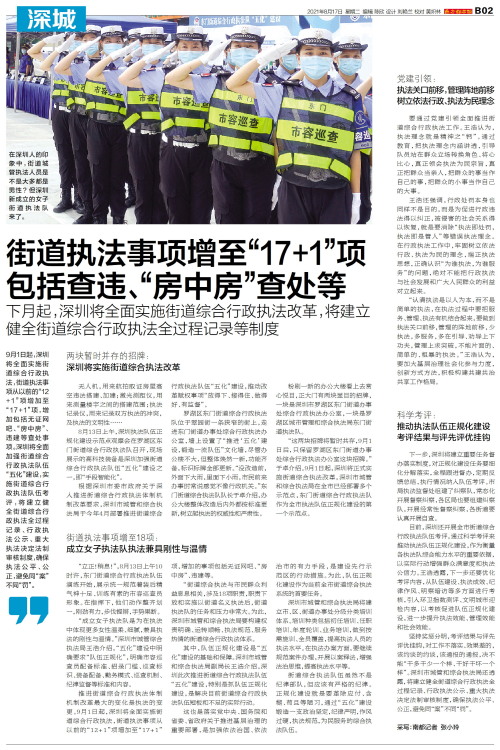9月1日起,深圳将全面实施街道综合行政执法,街道执法事项从以前的“12+1”项增加至“17+1”项,增加包括无证网吧、“房中房”、违建等查处事项。深圳将全面加强街道综合行政执法队伍“五化”建设,实