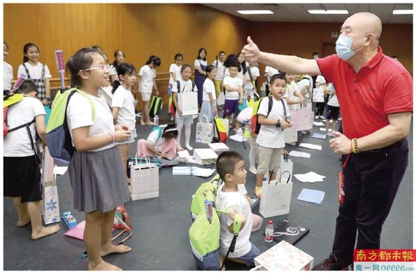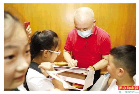 8月18日,是南都童声合唱团的探班日。南都乡村留唱音乐教室的联合主办单位华联发展集团和南方都市报的相关负责人来到培训教室,探望小朋友们。这已经是华联集团董事长、总裁、党委书记董炳根第四年带着礼物来到合唱团探班。大朋友“董爷爷”的出现让合唱团教室瞬间热闹起来,不少小朋友围住董爷爷索要签名,称以后要拿着去该公司求职。