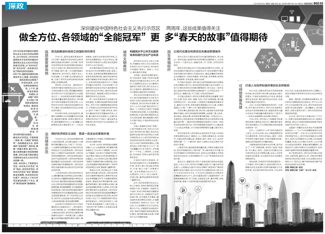 8月18日是深圳建设中国特色社会主义先行示范区两周年。2019年8月,《中共中央国务院关于支持深圳建设中国特色社会主义先行示范区的意见》印发,从“先行先试”到“先行示范”,深圳再次扛起了新时代的历