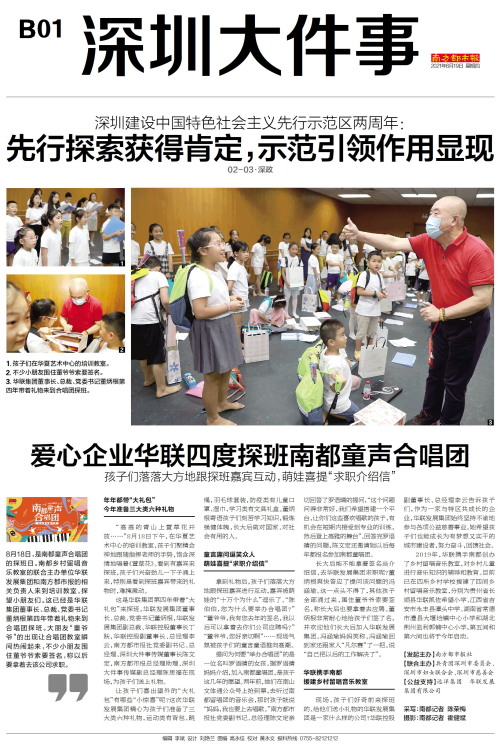 8月18日,是南都童声合唱团的探班日。南都乡村留唱音乐教室的联合主办单位华联发展集团和南方都市报的相关负责人来到培训教室,探望小朋友们。这已经是华联集团董事长、总裁、党委书记董炳根第四年带着礼物来