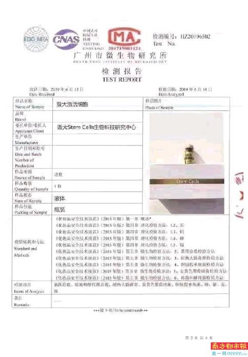 在商家展示的商品详情页中,有一份由广州市微生物研究所出具的产品检测合格报告,报告提交单位是“暨大Stem Cells生物科技研究中心”。随后,课题组向该检测机构查询,得到的回应是:经查实,您提供的检测报告扫描件第二页信息和我单位存档的信息不符,该报告样品名称、品牌、委托单位、样品状态、样品包装和样品照片有篡改,不是我单位出具的。