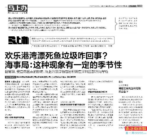 8月21日,南都记者报道了宝安区欢乐港湾岸边漂浮死鱼垃圾的情况,引发市民的广泛关注。8月23日,记者从宝安区相关部门了解到,造成垃圾聚集的原因,主要是受季节性天气及洋流等因素的影响,公共海域及珠江口内存在的垃圾随风向及洋流逐渐聚集在前海湾。